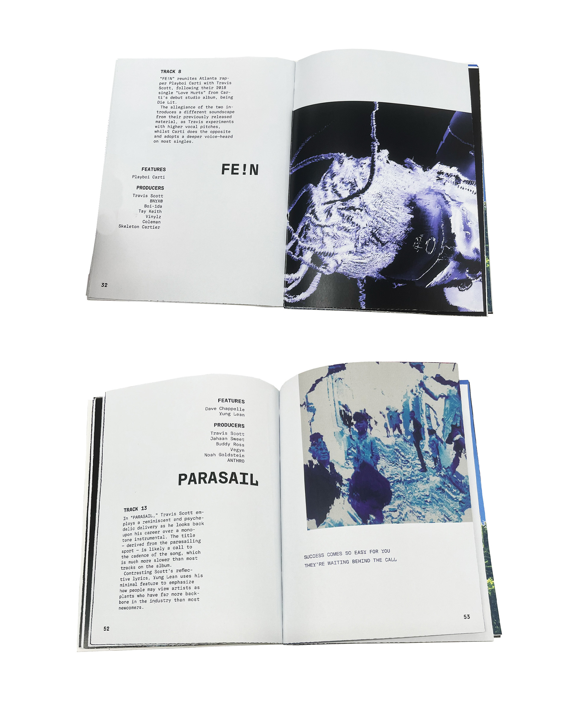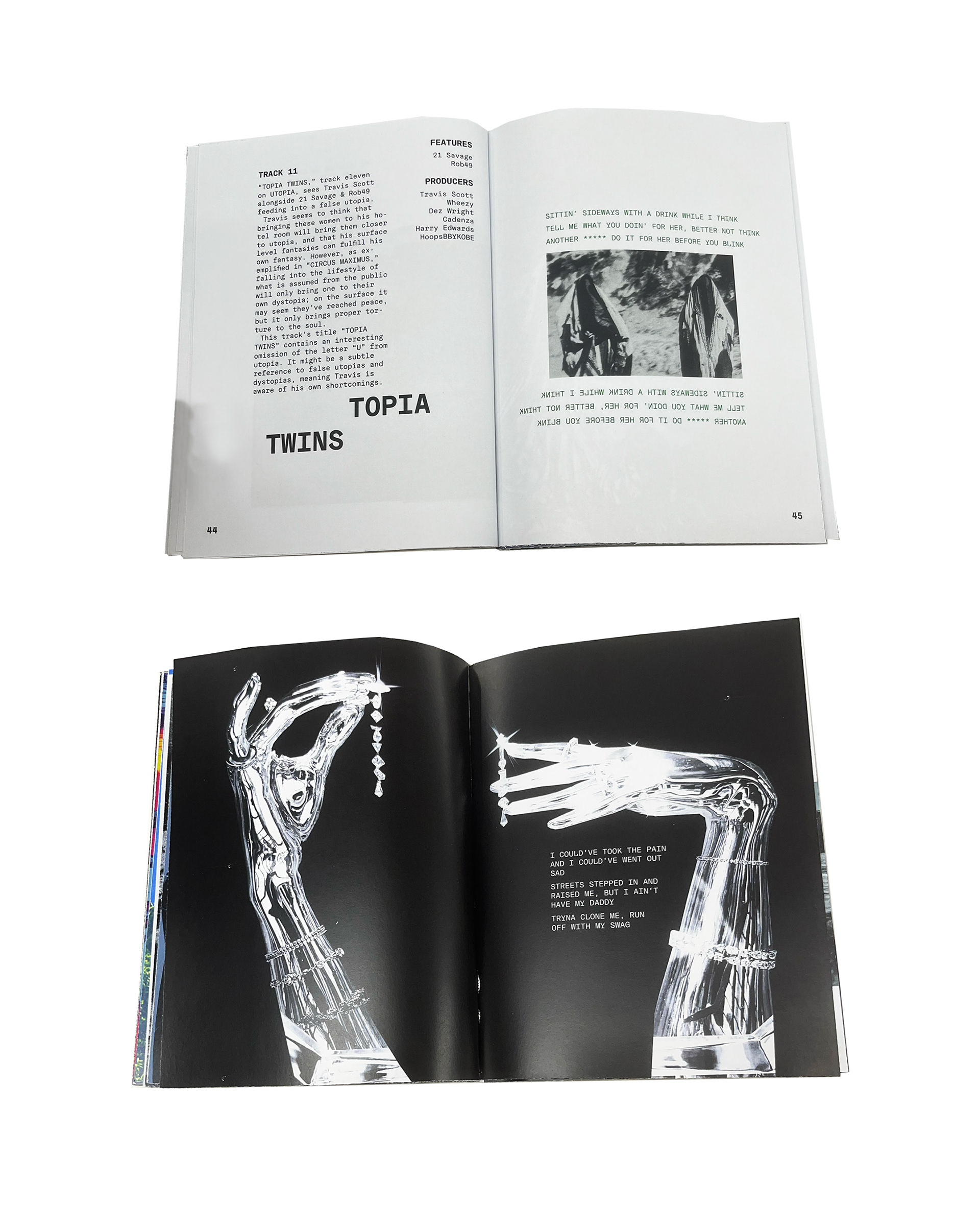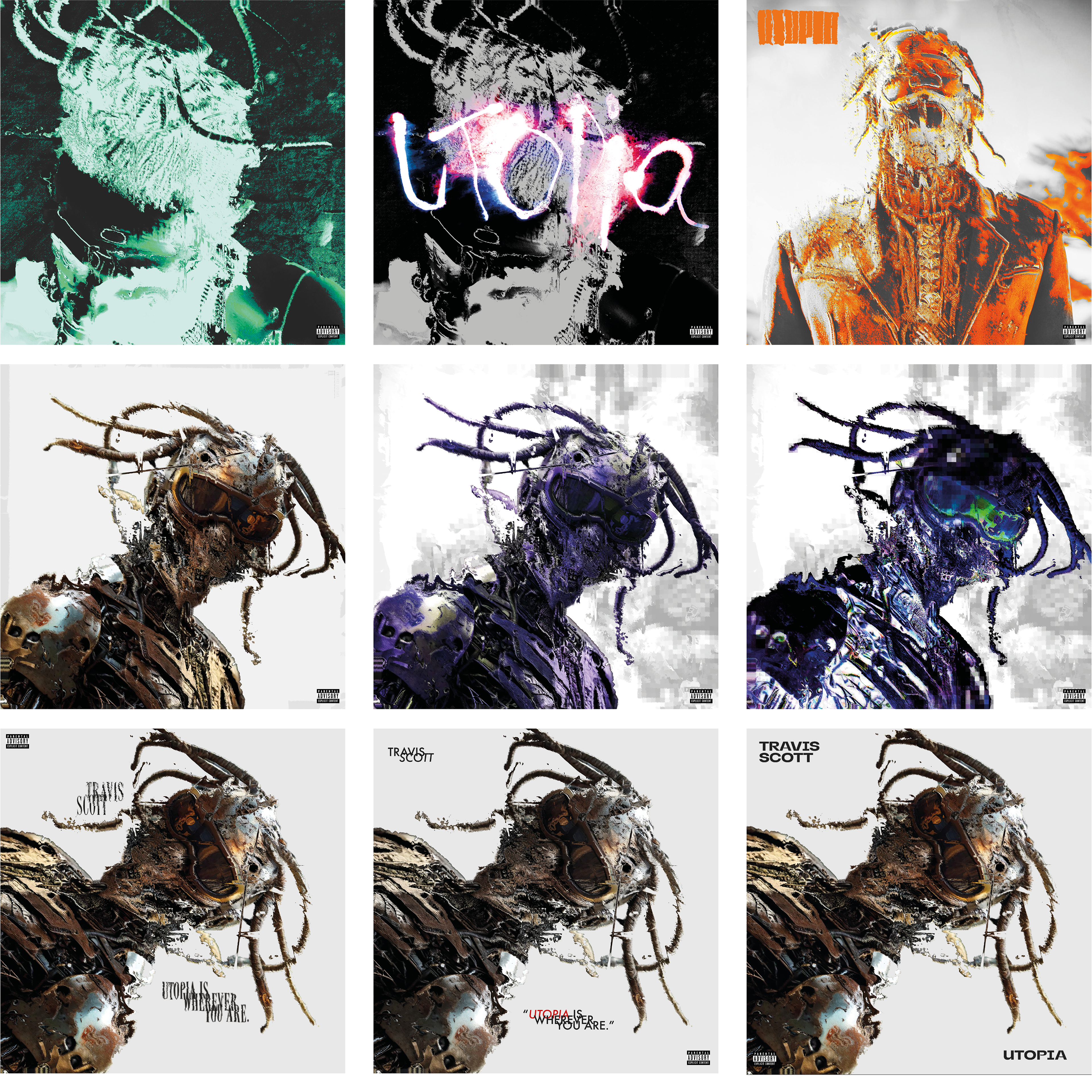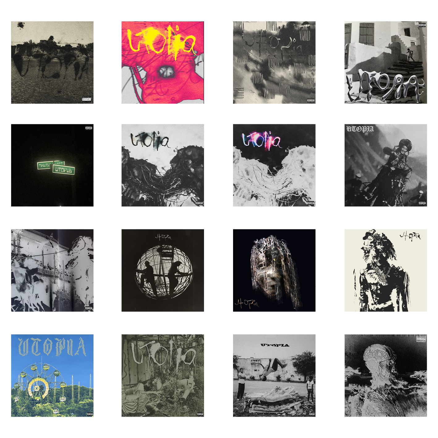This project successfully repackages the album by translating its dark, experimental atmosphere into a dystopian visual identity. The rough, grungy imagery and distorted half-robot portrayal of Travis Scott reflect imperfection and futurism, while the angled composition, raw textures, and muted brown tones move away from polished, conventional hip-hop aesthetics. Experimental typography and an unstructured, grid-free layout further break industry norms, mirroring the album’s unconventional sound. Familiar elements such as Travis Scott’s silhouette and dreads maintain recognisability for fans, while movement and distortion connect to the energy of the music. The use of whitespace reinforces the album’s message that “Utopia is wherever you are”.